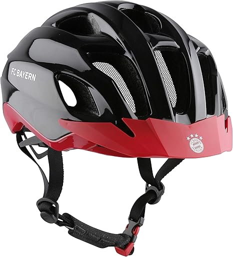 Fc bayern fahrradhelm. Der rote helm ist vorne mit einem weißen fc bayern schriftzug verziert seitlich sind jubelnde fans abgebildet. Dank des helmschilds mit dezentem vereinsemblem und den reflektierenden fc bayern schriftzügen wird auch im straßenverkehr gezeigt für welchen verein man unterwegs ist. Und das ist auch gut so denn der sorgt für sicherheit und sichtbarkeit im straßenverkehr dafür sorgt das integrierte led rücklicht hinten am helm. Mit dem roten fahrradhelm junior red m haben unsere jüngeren fans den fc bayern münchen nicht nur im sondern auch auf dem kopf.