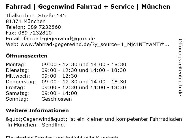 Gegenwind fahrrad service thalkirchner straße münchen. Fahrradwerkstatt auf der karte telefon. 9 00 uhr 12 30 uhr und 14 00 uhr 18 30 uhr. Infos zu fahrrad service gegenwind rothörl u. Ein starker service und individuelle kundenbetreuung sind die wichtigsten bestandteile unserer arbeit.
